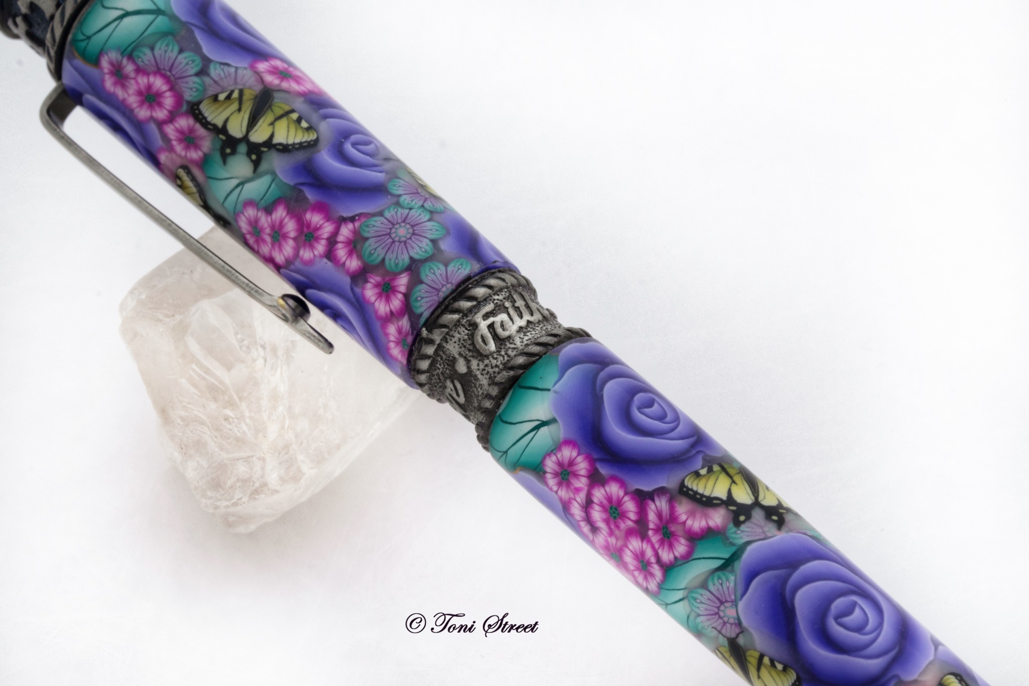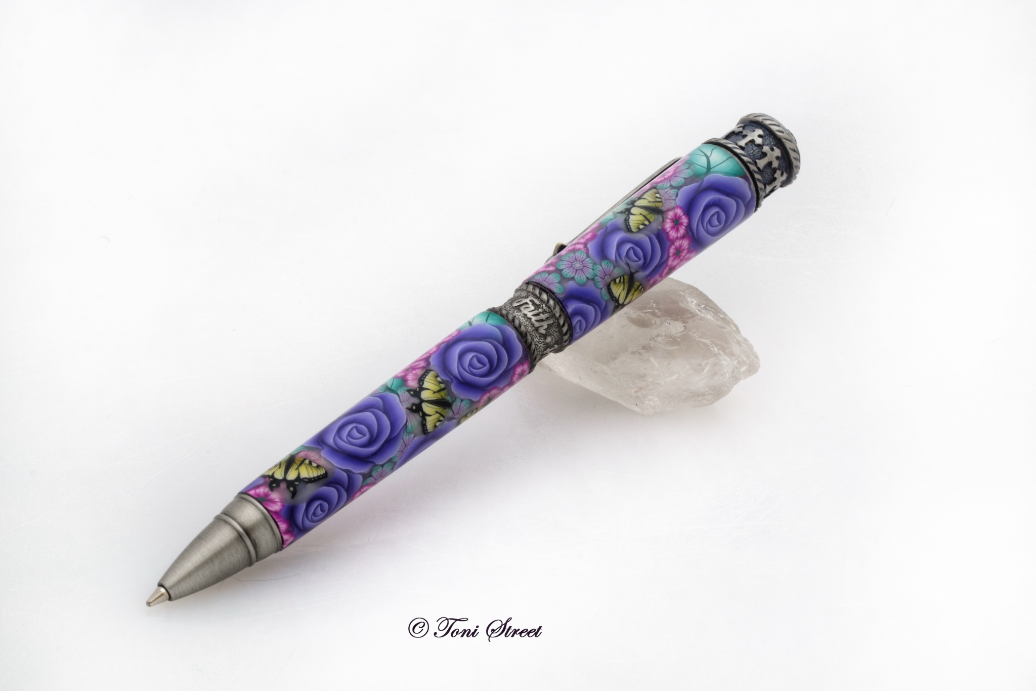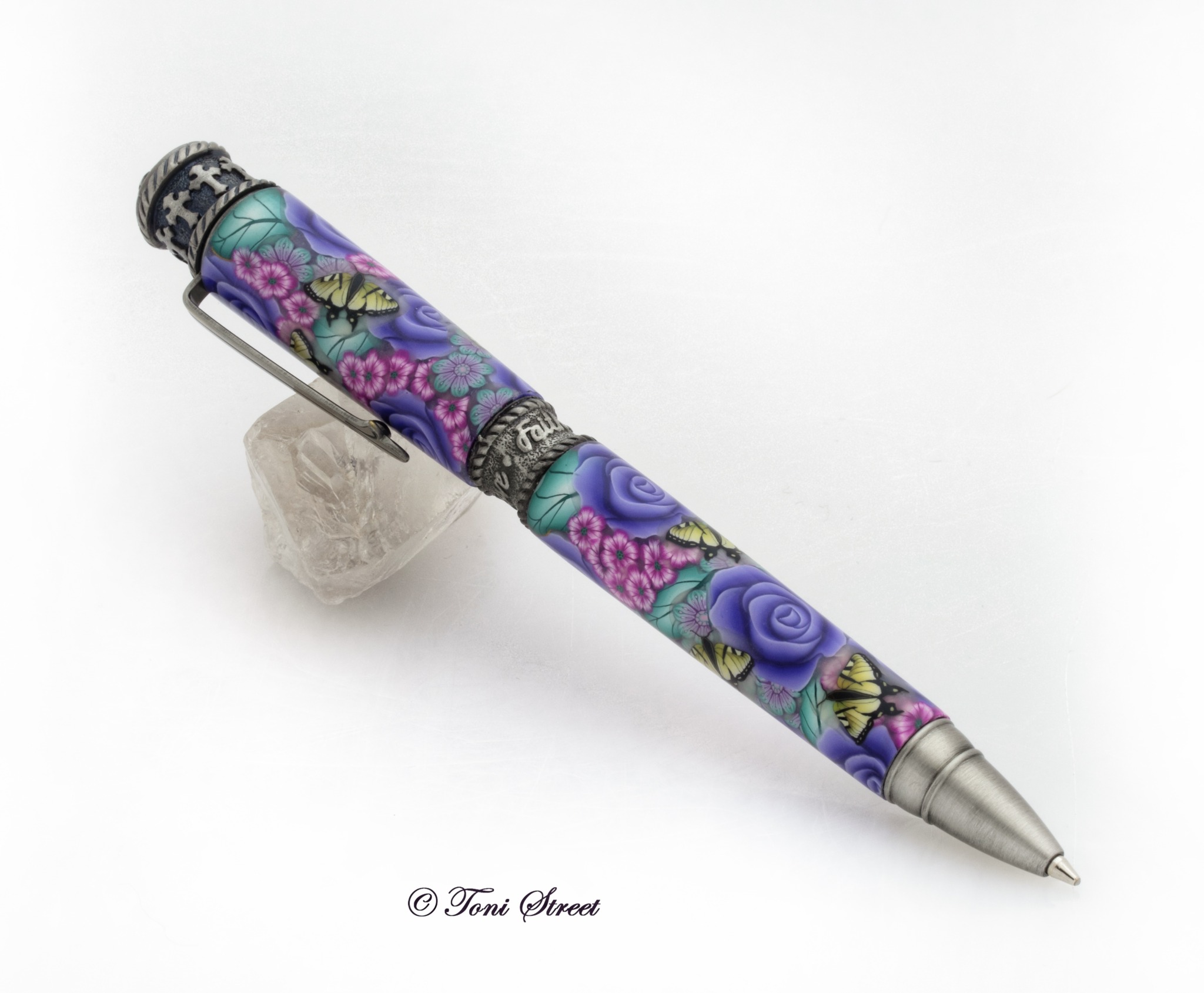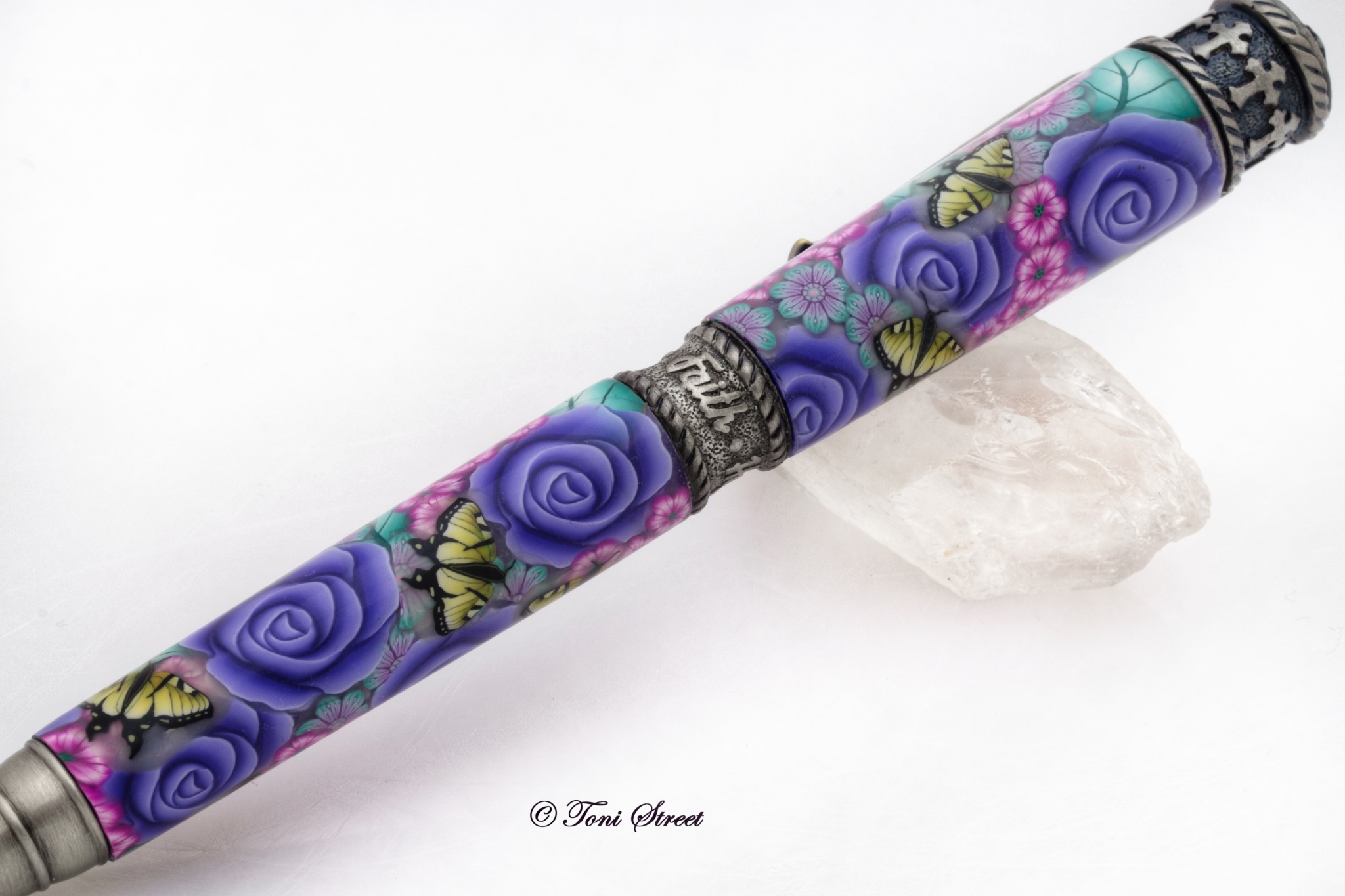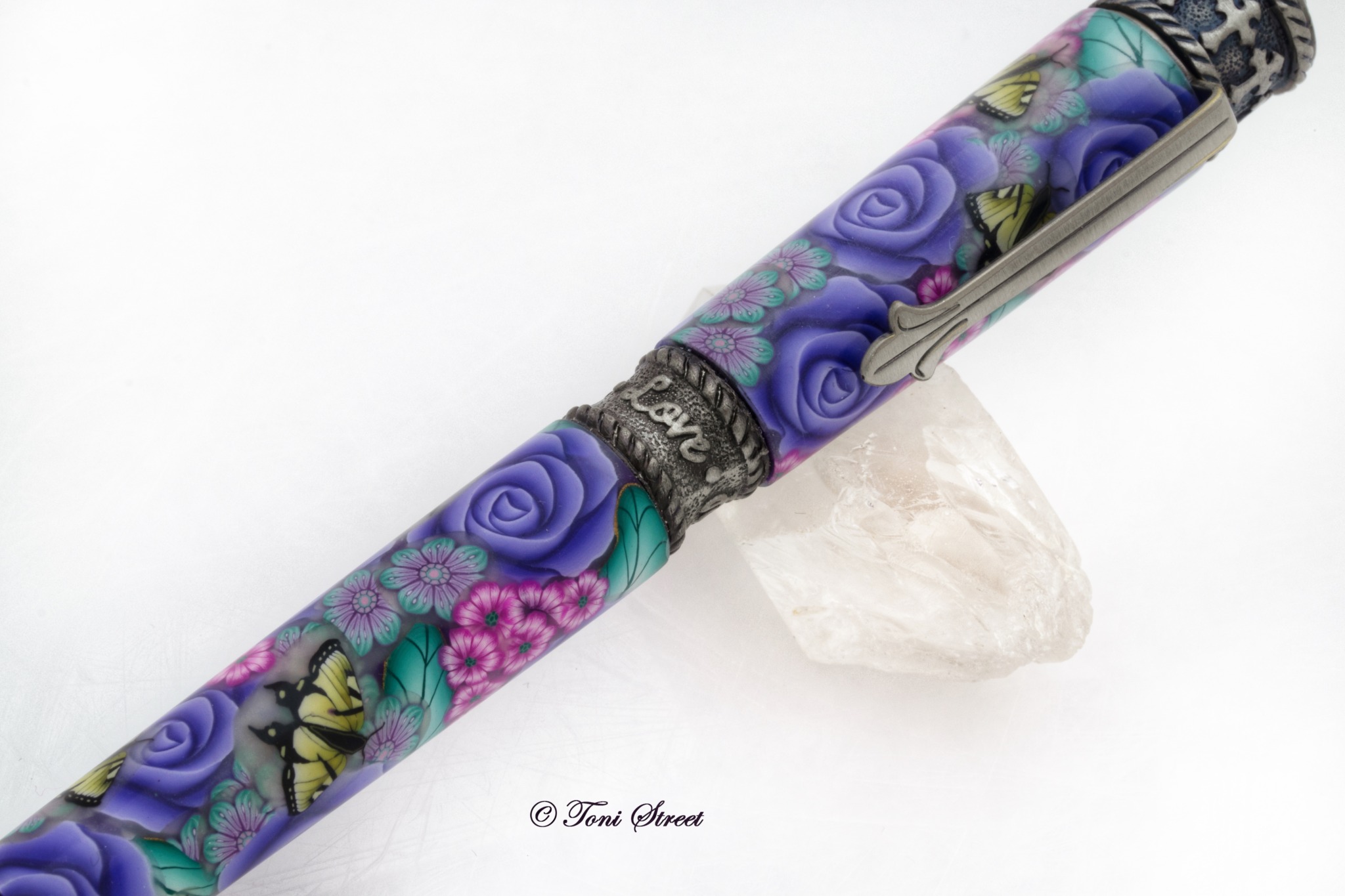 This gorgeous pen is decorated with millefiori flowers made out of polymer clay, which is an ancient glass blowing technique that has been reproduced using polymer clay. You will find a beautiful garden of Purple Roses, Purple Flowers with Yellow Swallowtail Butterflies. Pen is handcrafted by Toni Street using brass tubes covered with polymer clay. This would make a very special gift for anyone.