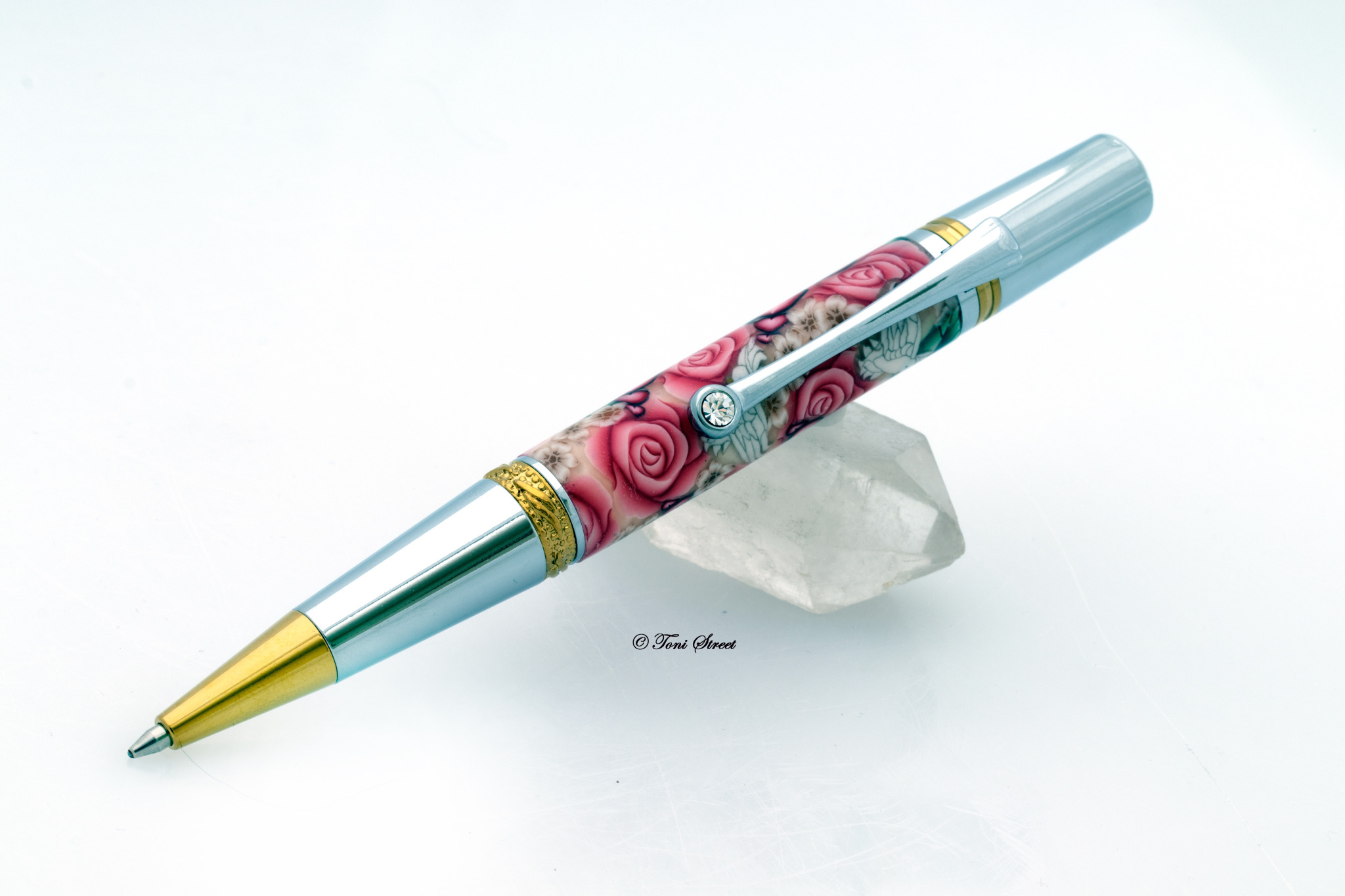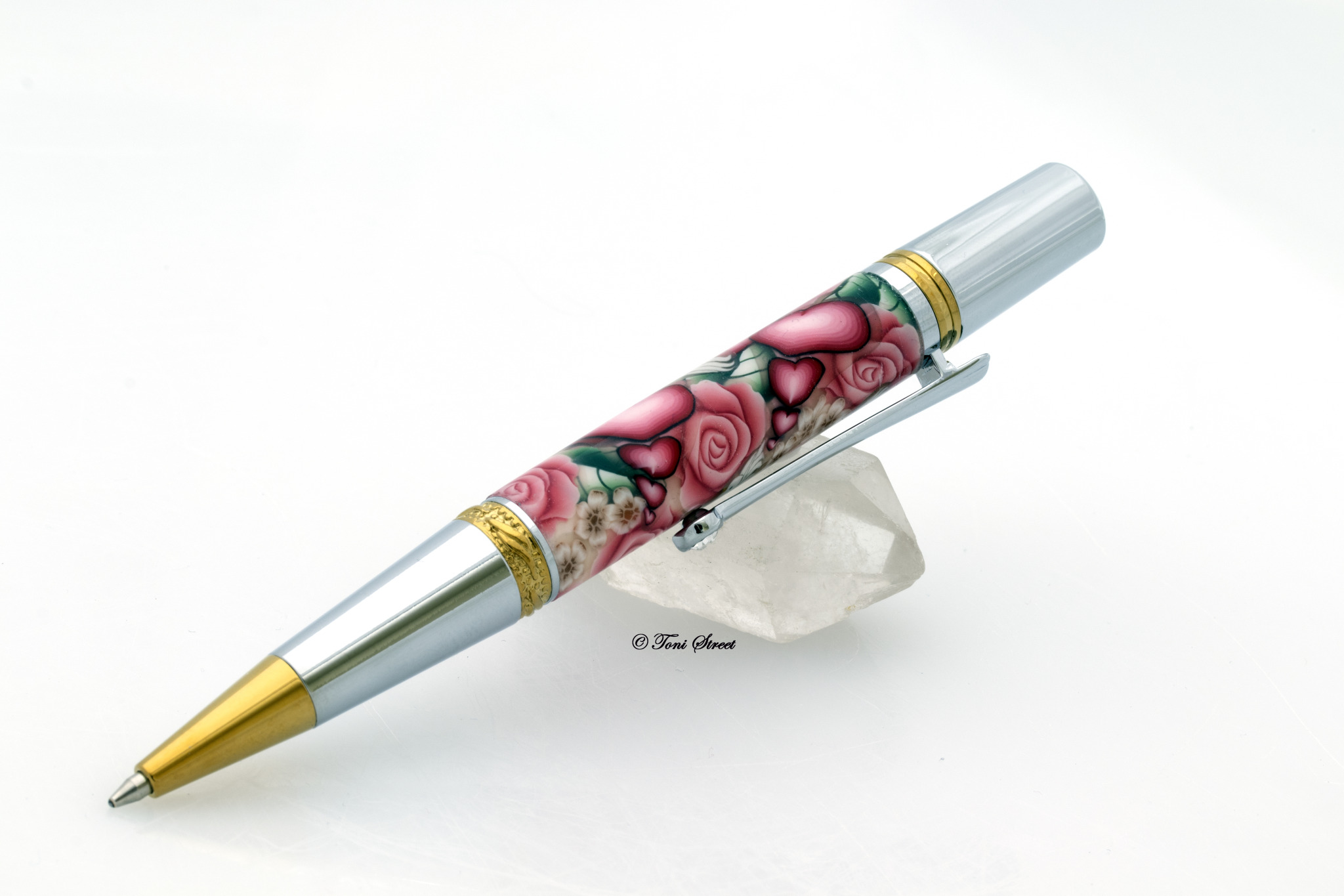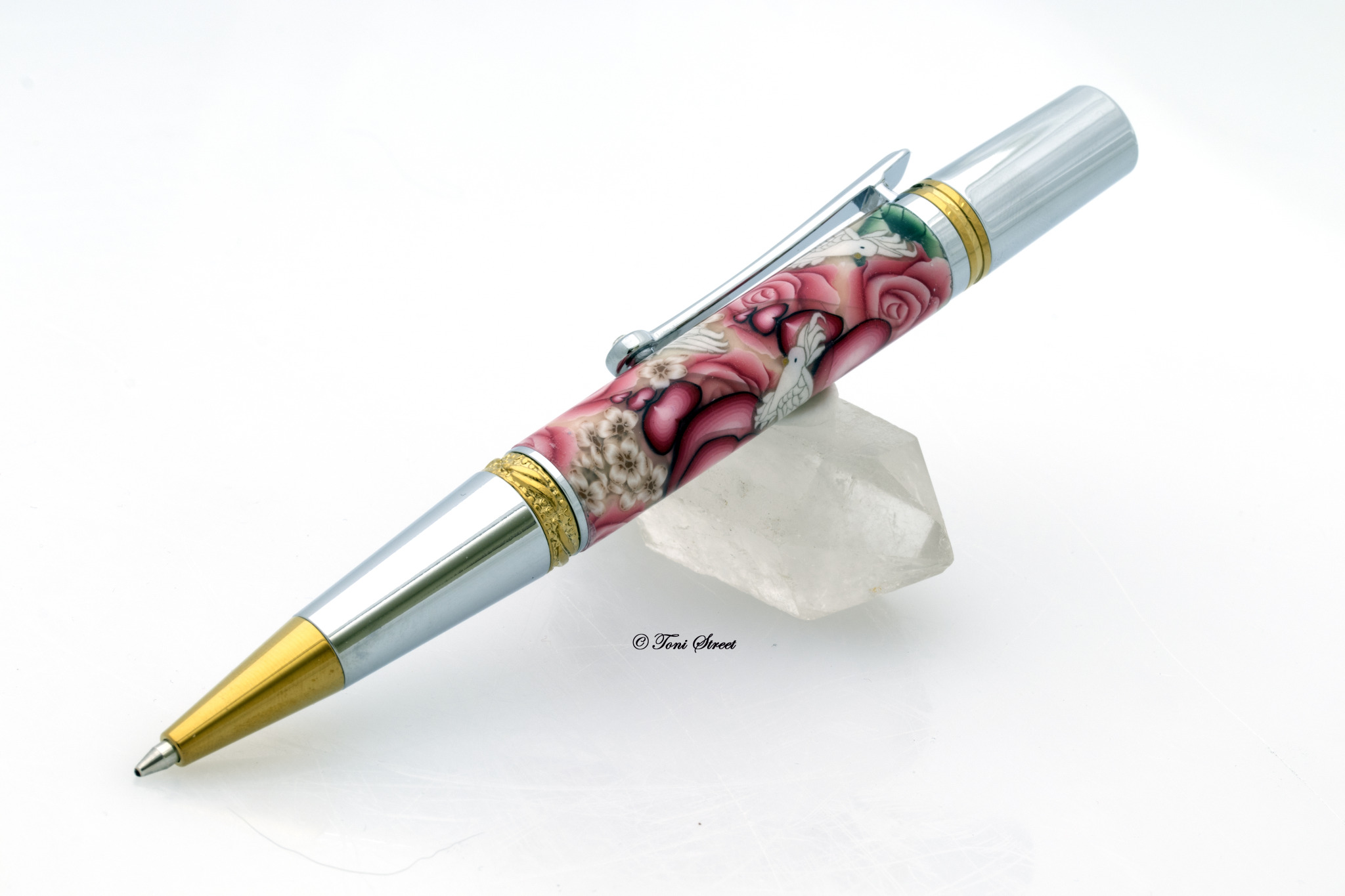 This gorgeous pen is decorated with millefiori flowers made out of polymer clay, which is an ancient glass blowing technique that has been reproduced using polymer clay. You will find a beautiful garden of Red Roses, White Flowers, Red Hearts that Sparkle with White Doves on this pen. Pen is handcrafted by Toni Street using brass tubes covered with polymer clay. This would make a very special gift for anyone.