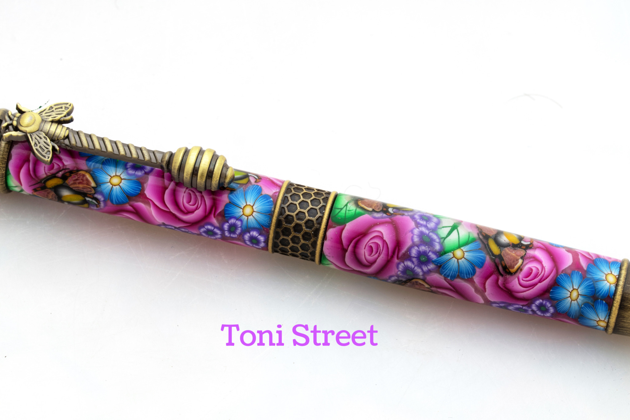 This gorgeous pen is decorated with millefiori Magenta Roses and Blue and Purple Flowers with Bumblebees on this pen. Pen is handcrafted by Toni Ransfield using brass tubes covered with polymer clay. This would make a very special gift for anyone.