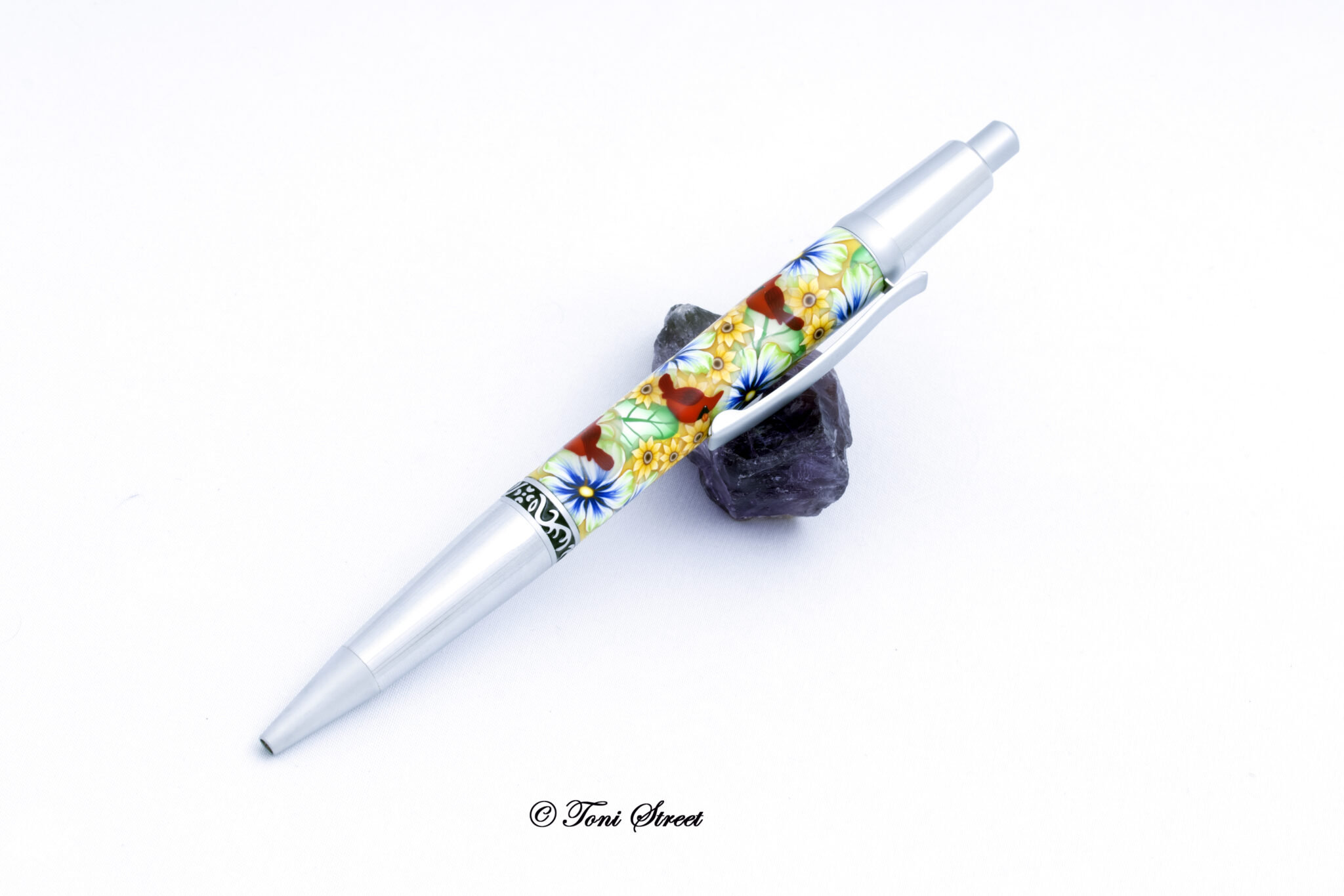 This gorgeous pen is decorated with millefiori flowers made out of polymer clay, which is an ancient glass blowing technique that has been reproduced using polymer clay. You will find a beautiful garden of Sunflowers and Green and Dark Blue Flowers with Cardinals on this pen. Pen is handcrafted by Toni Ransfield using brass tubes covered with polymer clay. This would make a very special gift for anyone.